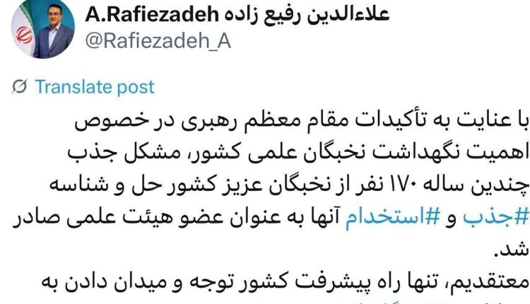 با عنایت به تاکیدات رهبر معظم انقلاب در خصوص اهمیت نگهداشت نخبگان علمی کشور، مشکل جذب چند ساله ۱۷۰ نفز از نخبگان عزیز کشور حل و شناسه جذب و استخدام آنها به عنوان عضو هیئت علمی صادر شد.
