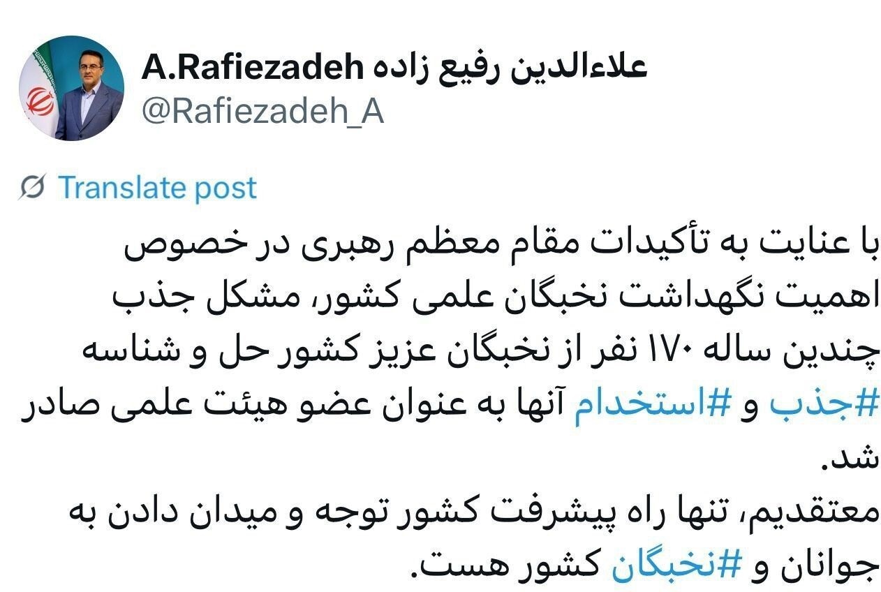 علاءالدین رفیع زاده معاون رئیس جمهور و رئیس سازمان اداری و استخدامی کشور در صحفه شخصی خود در شبکه اجتماعی ایکس نوشت: